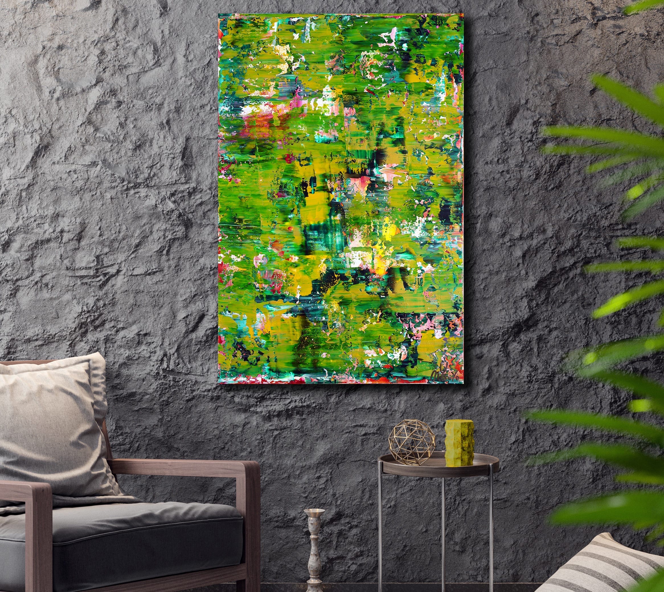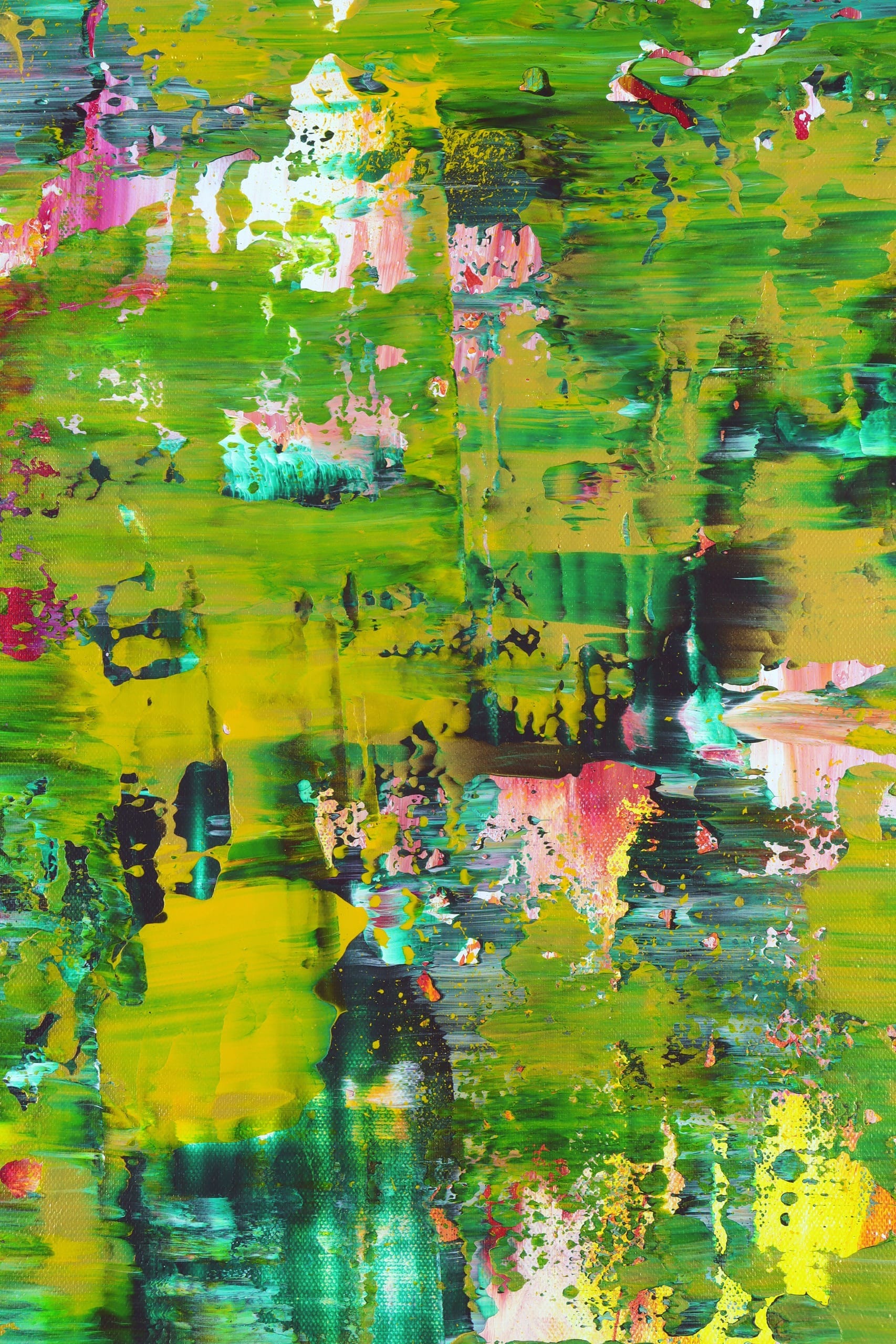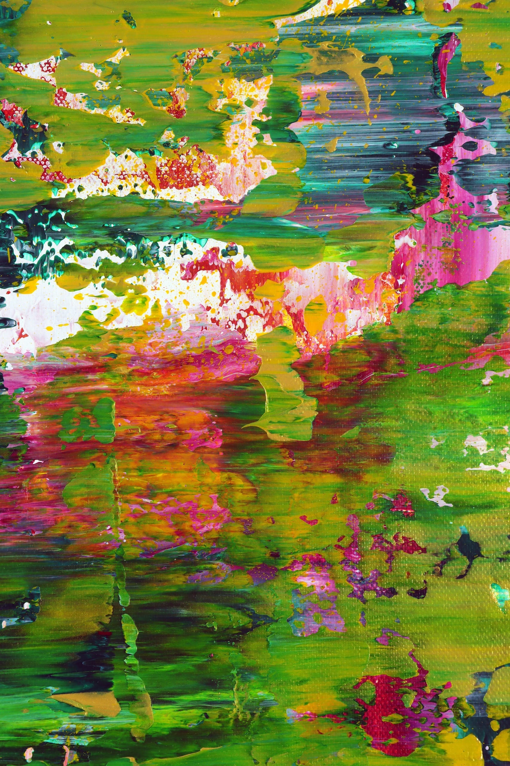 The canvas explodes with a lush palette of vibrant greens, accented by bursts of yellow, pink, red, and touches of black and blue. These dynamic hues swirl and layer in bold, textured strokes, creating a symphony of color and movement that feels like a verdant landscape reborn. The expressive application of acrylic and mixed media, with drips, splashes, and textured surfaces, adds depth and vitality, transforming the painting into a visual celebration of growth and transformation.