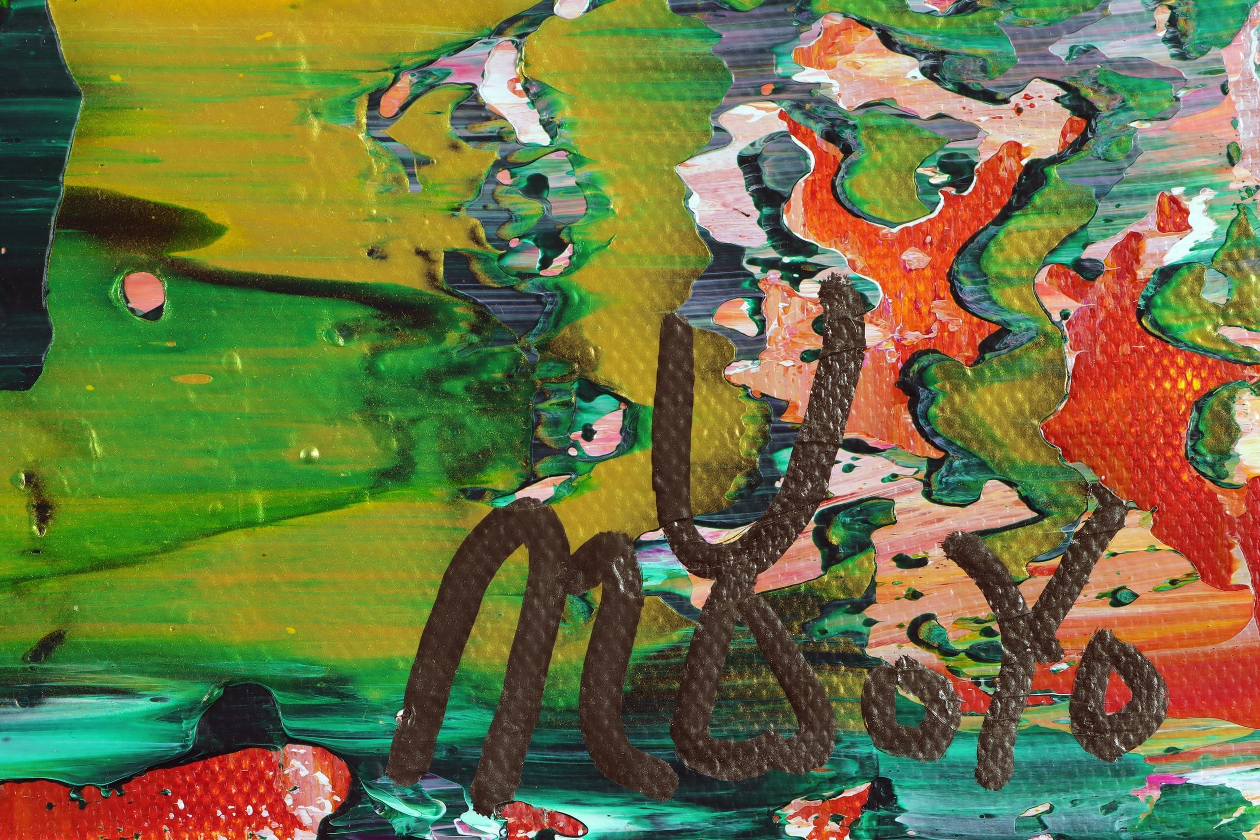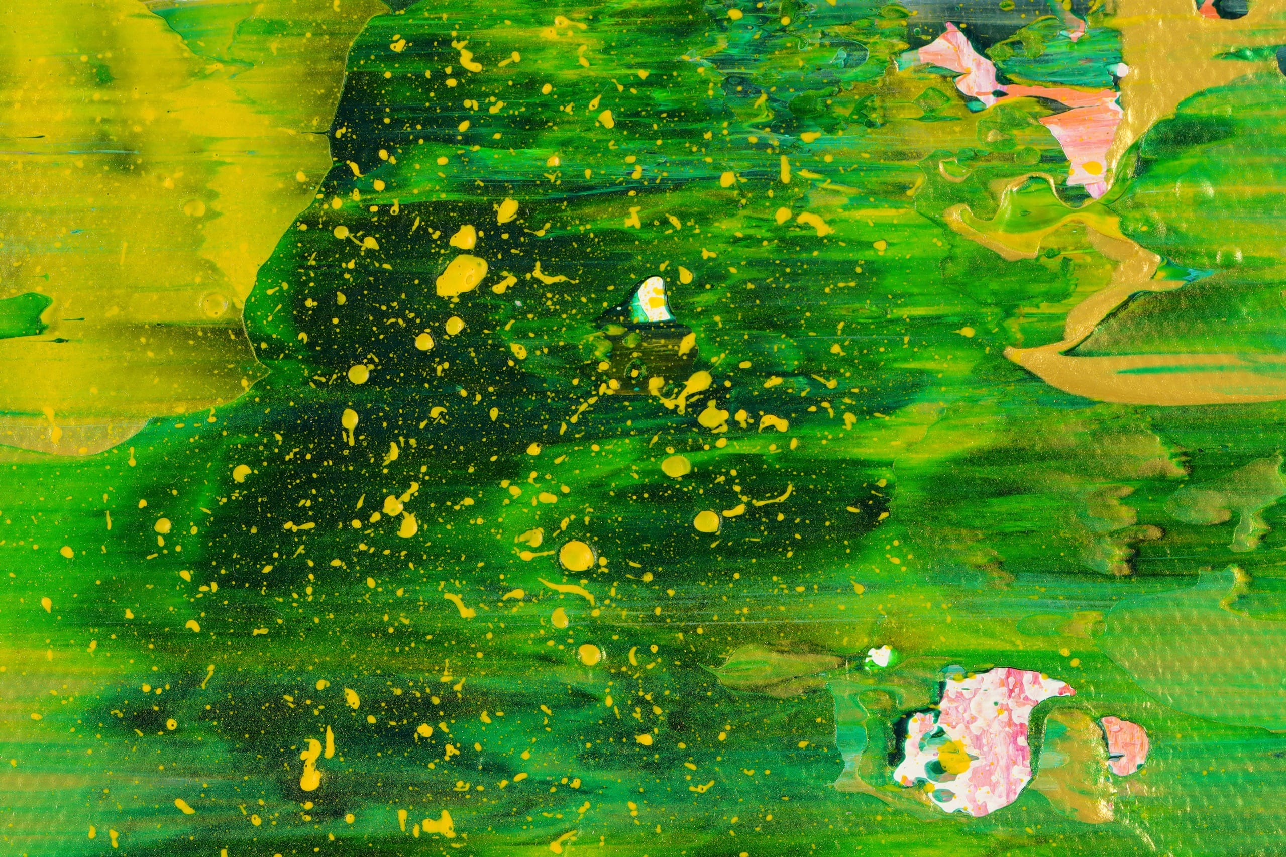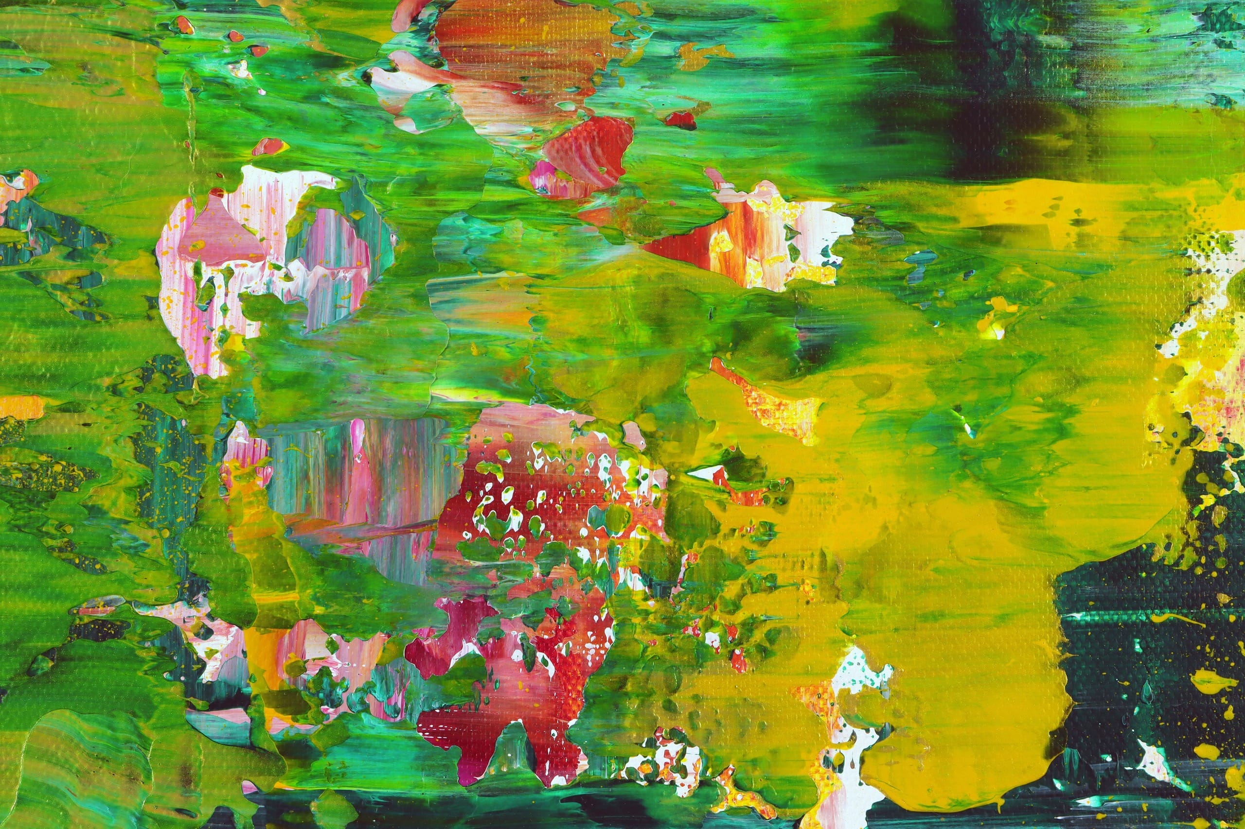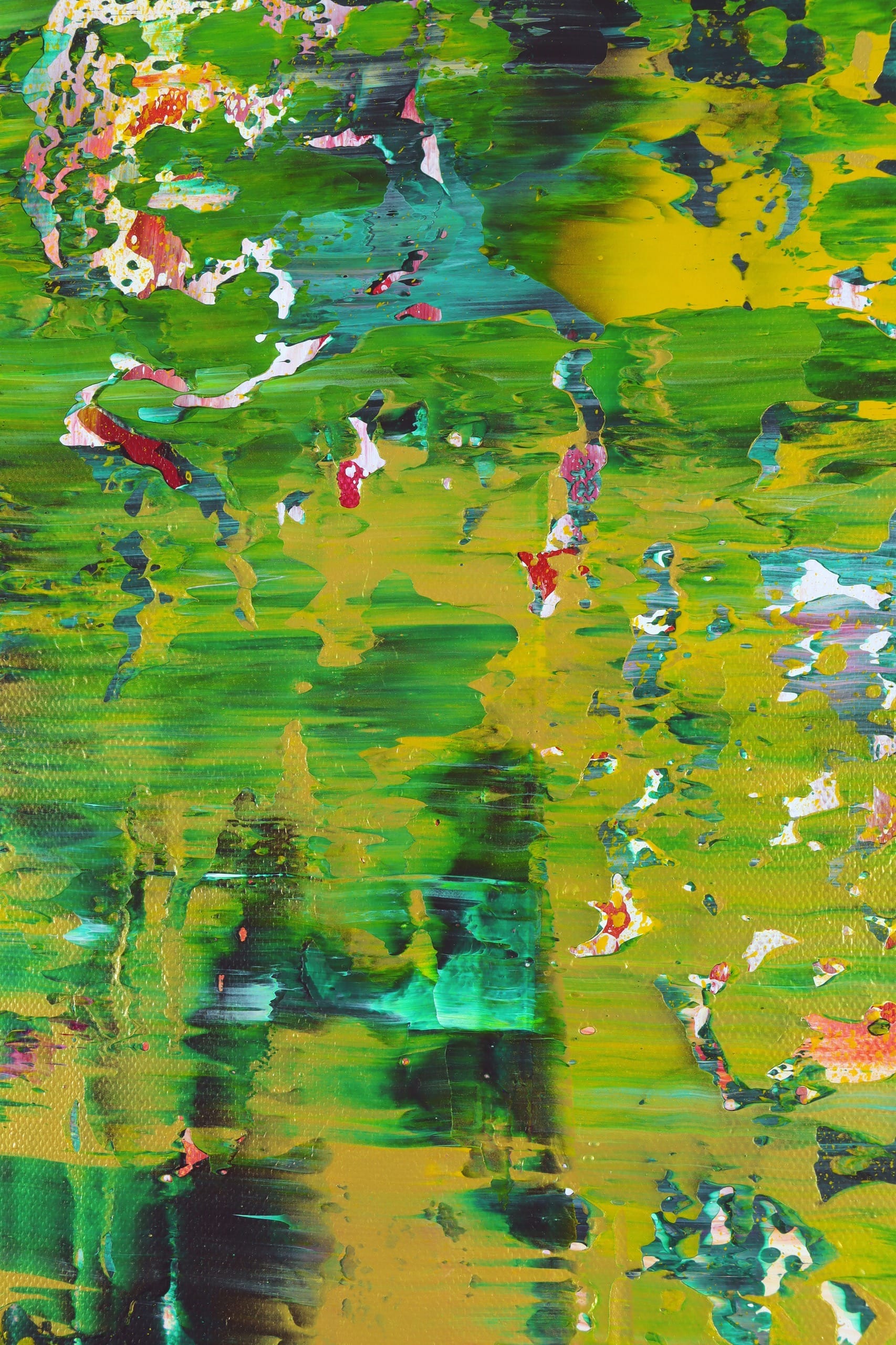 The canvas explodes with a lush palette of vibrant greens, accented by bursts of yellow, pink, red, and touches of black and blue. These dynamic hues swirl and layer in bold, textured strokes, creating a symphony of color and movement that feels like a verdant landscape reborn. The expressive application of acrylic and mixed media, with drips, splashes, and textured surfaces, adds depth and vitality, transforming the painting into a visual celebration of growth and transformation.