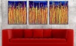 Expressive, bold full of live and shimmer! inspired by nature, many colors combined with mica particles. Red, yellow and purple over deep blue background. Ready to hang and signed on the last canvas. Three canvases16 W x 20 H x 0.7 in each.